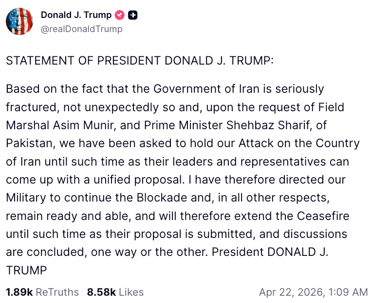 ٹرمپ نے بتایا کہ ایران کی قیادت کو متفقہ تجویز پیش کرنے کا وقت دیا جا رہا ہے۔ اس مقصد کے تحت جنگ بندی میں توسیع کی گئی ہے تاکہ مذاکرات کی راہ ہموار ہو سکے۔